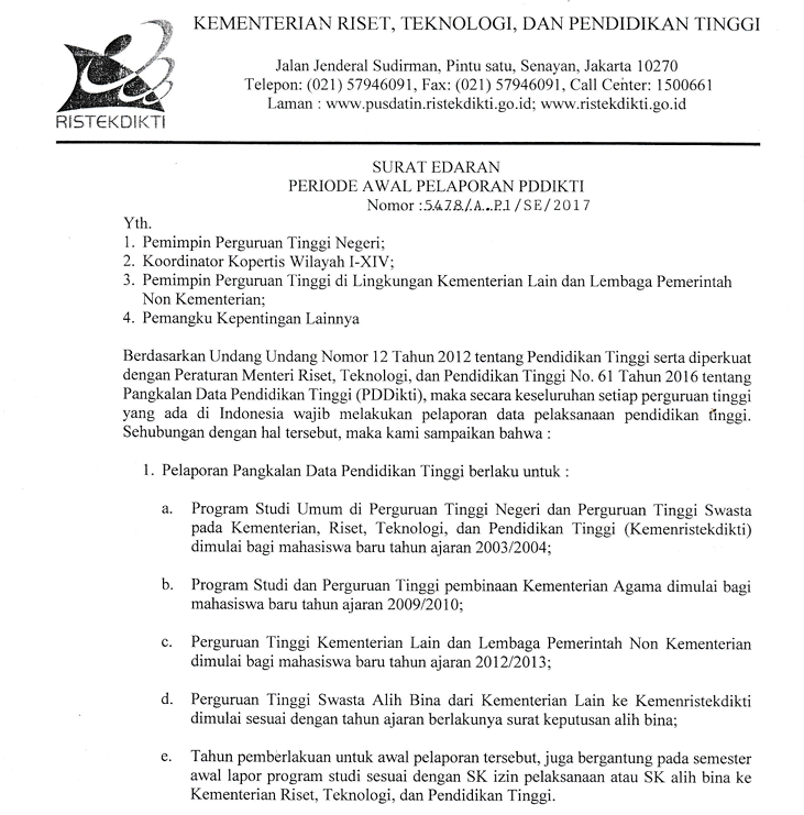 Kementerian Riset, Teknologi, dan Pendidikan Tinggi melalui Surat Edaran Nomor 5478/A.P1/SE/2017 menetapkan bahwa seluruh perguruan tinggi di Indonesia wajib melaporkan data mahasiswa ke Pangkalan Data Pendidikan Tinggi (PDDIKTI) secara lengkap, valid, dan tepat waktu, dengan ketentuan pelaporan dimulai sejak tahun ajaran 2003/2004 untuk perguruan tinggi umum, 2009/2010 untuk perguruan tinggi keagamaan, serta 2012/2013 untuk perguruan tinggi di bawah kementerian dan lembaga pemerintah non-kementerian, guna menjamin keabsahan data akademik dan kemudahan proses verifikasi lulusan di seluruh Indonesia.